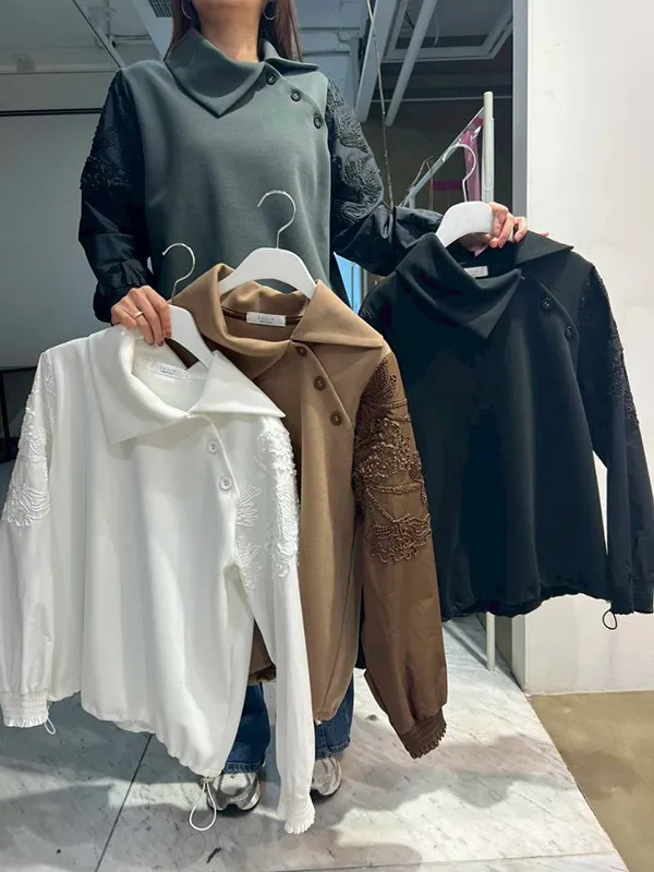 側翻領釦袖拼接衣