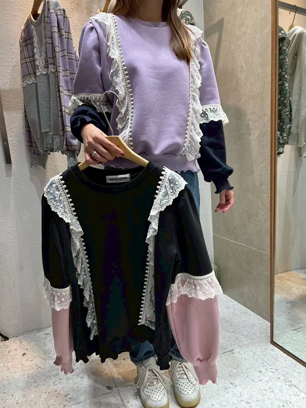 袖接配色接蕾木耳邊衣
