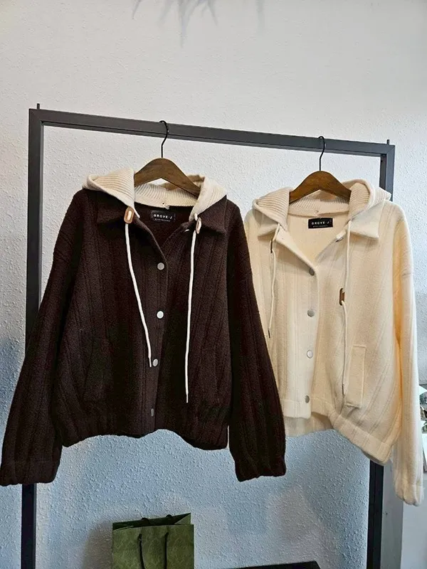 帽可拆坑條厚磅針織外套