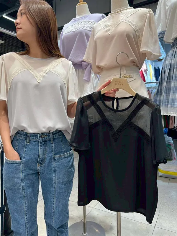 肩袖透紗設計拚接衣